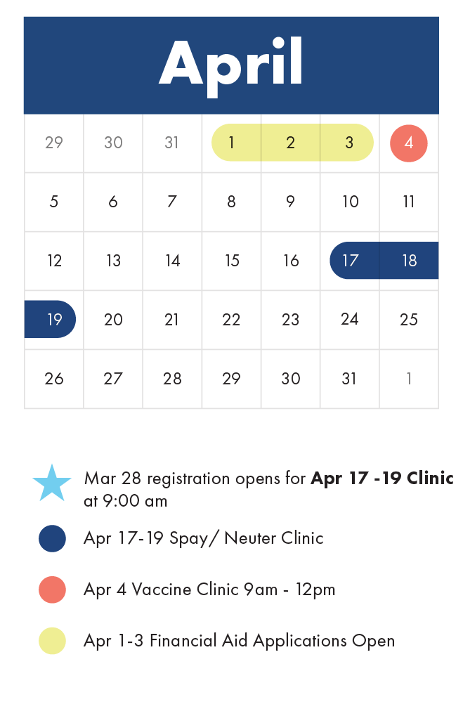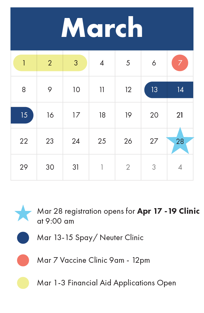 Our next Spay/Neuter clinic will be April 17-19, with registration opening on Saturday, March 28th at 9am.