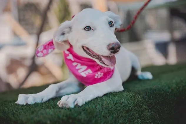 Meet Milk! This sweet girl was born in early February of this year and was found with her litter mates and mom. Currently she weighs around 20lbs and we estimate they will only be about 35lbs when fully grown or smaller. They were found abandoned on an old property and Mama was doing her best to keep herself and her pups alive. Milk loves playing in the puppy-pools and is very friendly with humans of all sizes. Despite a hard start Milk is very cuddly and playful with everyone she meets, and enjoys playing with dogs of all sizes. She is ready to start her next and best adventure with you!
