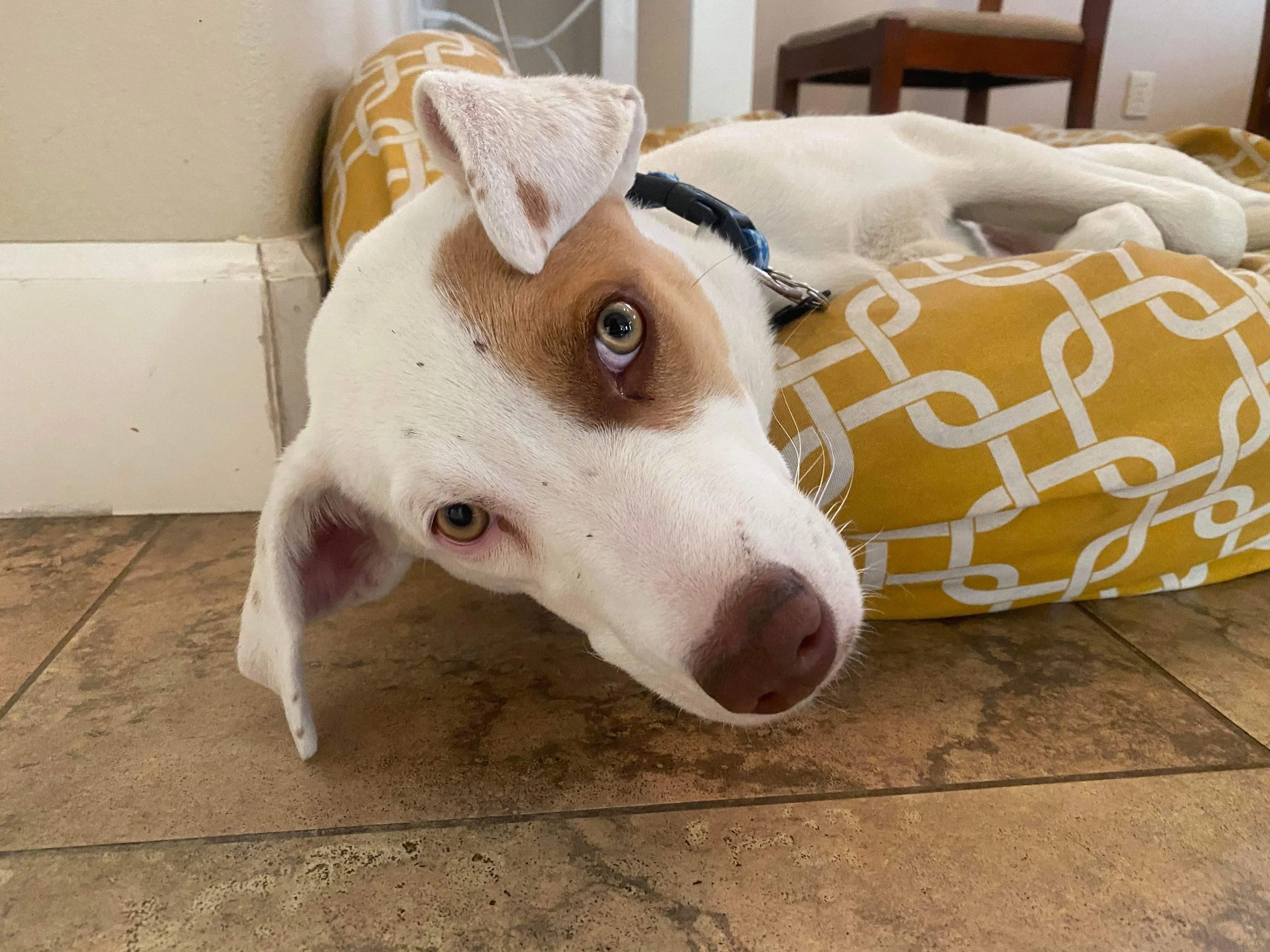 Meet Paige! Paige is part of the āPā litter, Pickles, Pepino and Pumpkin. This little cutie is so lovable and affectionate that her first request is for a belly rub! And then another belly rub and...well, you get the idea. Paige is a gorgeous white pup with a whimsical tan eye patch and sweet amber eyes. She is a fast learner and because of the lab in her, will relish any treats you dispense, whether they are food, kisses, pats, or (yes) belly rubs! She is crate trained and sleeps well through the night, no barking or whining. She is potty trained and does well on leash. Paige and her siblings were found in a junkyard and are now about 5 months old, 30lbs. This sweet gal is ready to start her next chapter with a family or BFF ready to give her all the belly rubs she deserves! She is being fostered in Bend, OR.
