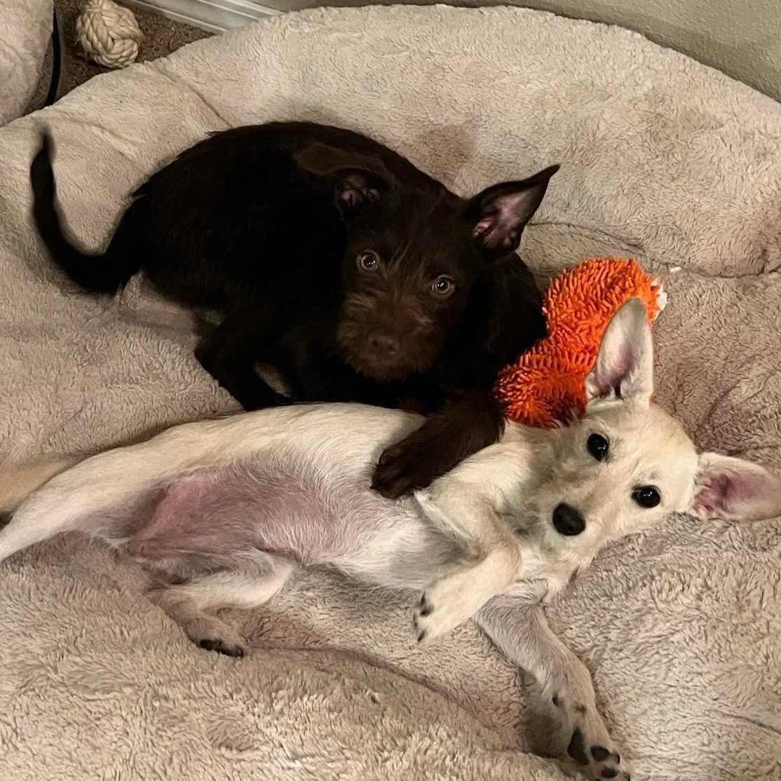 Meet Roux & Pixi! This precious duo are about 5 and 6 months old and the most precious pair on the planet. You would think they are siblings but they are best friends. At just 13lbs and 16lbs, with their adorable wire haired beards these two bring joy wherever they go. Roux is more outgoing of the pair and loves to explore and meet new people. She loves small children and is especially sweet and soft with them. Pixi is more shy but loves to snuggle and play and also enjoys kids and other dogs. They are both dainty little dolls that are sweet and gentle. They LOVE to snuggle with people and each other and are very much two peas in a pod! They are picking up potty training fast and do well in the crate alone. They love to sleep in bed with you and are doing well throughout the night. They are great with other dogs, cats and kids. These two are being fostered in Bend, OR and are ready to start their next and best chapter with you!
